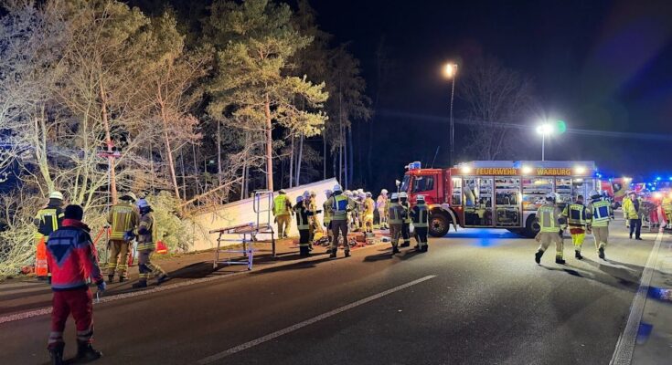Kassel (Hesse) – Serious accident on the A44 between Warburg and Breuna: A lorry left the road, hit a secured damaged car – and then fell ten meters down an embankment. Four people were injured, one of them seriously.