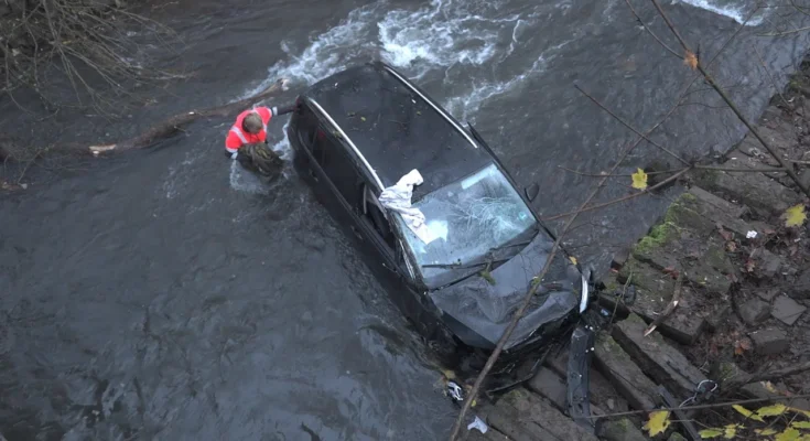 Neunkirchen (Saarland) – An icy ending to a car trip! In the early hours of the morning around 4am, a young driver (23) crashed into Blies on Flotowstrasse in Neunkirchen with full force. His car flew over the pavement, tore a traffic sign from its anchorage and fell to a depth of eight meters.