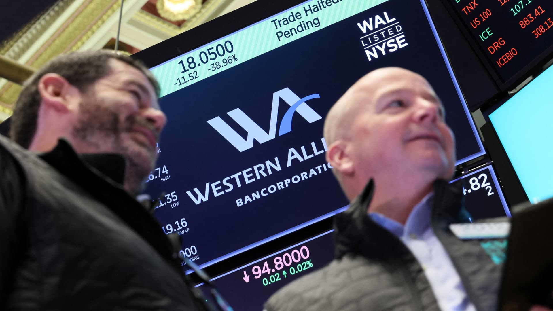 A screen displays that trading is halted for Western Alliance Bancorporation on the floor of the New York Stock Exchange (NYSE), May 4, 2023.