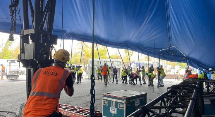 This involved deploying a huge canvas stretched to a height of almost 20 m using the single force of the arms of 65 technicians. An operation that in reality is more impressive than actually complicated because the mechanics are well oiled, and the task of a few minutes at the expense of effort is greeted with “Good job” and a round of applause. The maneuvers primarily illustrate the extent of the logistics of this Canadian blockbuster touring the globe.