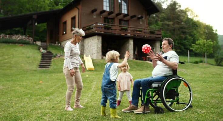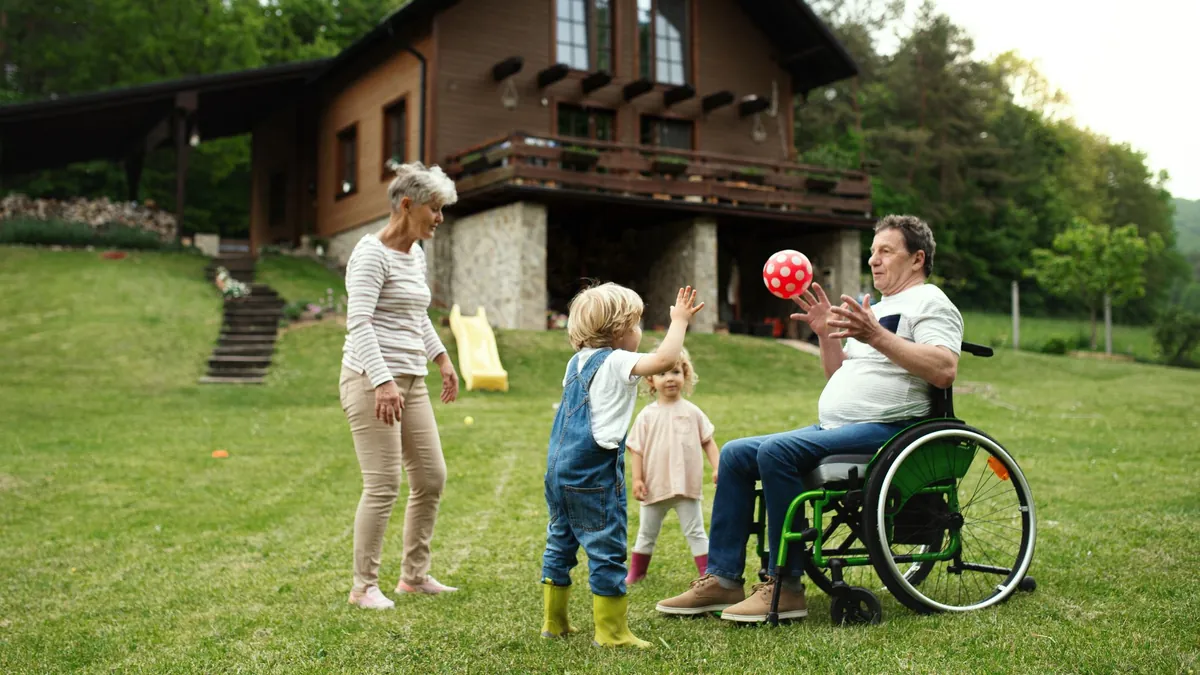 Man in wheelchair playing ball with childrenEnlarge the image