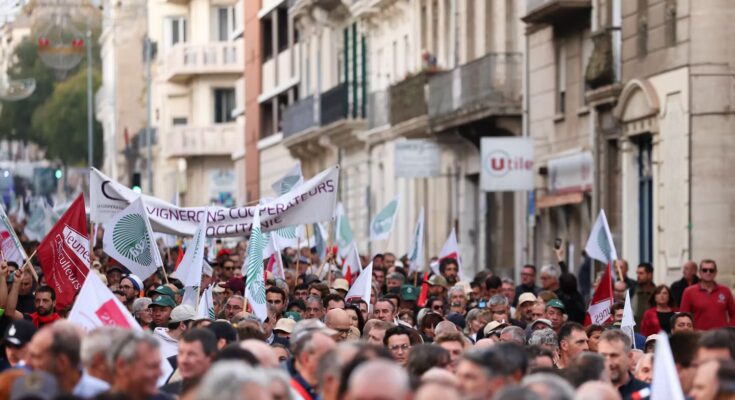 A calm, almost sombre procession marched through the streets of Béziers, like a dull cry of alarm. At the call of the Aude Grape Growers’ Union, the National Federation of Farmers’ Unions (FNSEA) and Young Farmers, 4,000 people, according to the prefecture of Hérault – more than 7,000, according to the organizers – marched in the town of Biter.