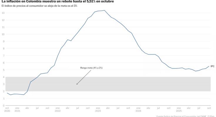 Inflation accelerates in Colombia. The consumer price index (CPI), which measures the increase in prices of goods and services, stood at 5.51% per year, according to the technical bulletin published this Monday by the National Administrative Department of Statistics (DANE). The data implies a rebound of 33 basis points from September figures (5.18%) and the highest figure since September 2024. Thus, the battle to keep inflation in the 3% range now amounts to 51 consecutive months of defeat for the Bank of the Republic.