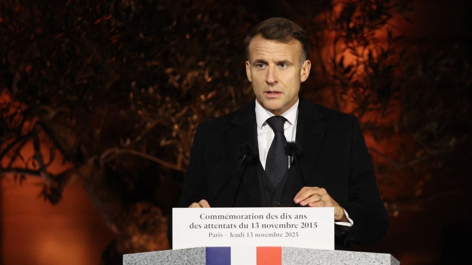 Emmanuel Macron gives a speech at the commemoration of November 13, in Paris, November 13, 2025. (LUDOVIC MARIN / AFP)