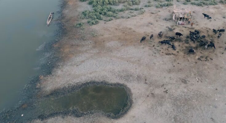 Under a scorching sun – temperatures have approached 50 degrees all summer, exceeding it on several occasions – Rashan steers his boat, avoiding areas of exposed land. The water is both brackish and cloudy. The hull gets stuck in the mud several times. Here and there, the carcasses of buffaloes and cows emerge from the surface, traditionally bred in these wetlands, victims of extreme salinisation.