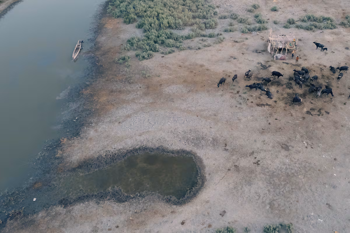Under a scorching sun – temperatures have approached 50 degrees all summer, exceeding it on several occasions – Rashan steers his boat, avoiding areas of exposed land. The water is both brackish and cloudy. The hull gets stuck in the mud several times. Here and there, the carcasses of buffaloes and cows emerge from the surface, traditionally bred in these wetlands, victims of extreme salinisation.