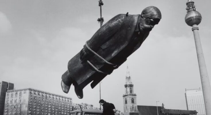 The photograph captures a decisive moment: a monumental statue of the philosopher Friedrich Engels hangs in the air. In the background, apartment blocks coexist with the St. Mary’s Church tower and the television tower in East Berlin’s historic Mitte district, underlining the contrast between past and present. Its author is the German photographer Sibylle Bergemann (1941-2010), one of the great references of German photography of the last decades of the 20th century. Seen today, the image invites us to think that we are faced with yet another document of the decline of an idol; read the scene as a retreat, the consequence of a historical turning point. However, the image was taken during the installation process of the Marx-Engels Forum, dedicated to the two central figures of official history. A detail that dismantles our first certainties and reveals how history – and our gaze – can reverse the meaning of the same image.