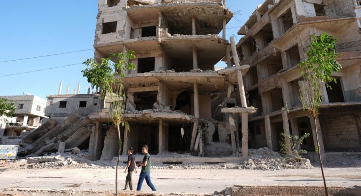 Syria, Harasta: Johann Wadephul (L, CDU), Federal Minister of Foreign Affairs, stands on the street in front of houses destroyed during the civil war during his visit to a humanitarian project with Raed Saleh (R), Minister of Civil Protection in Syria. During his visit to Syria, Foreign Minister Wadephul was shocked by the extent of the damage.